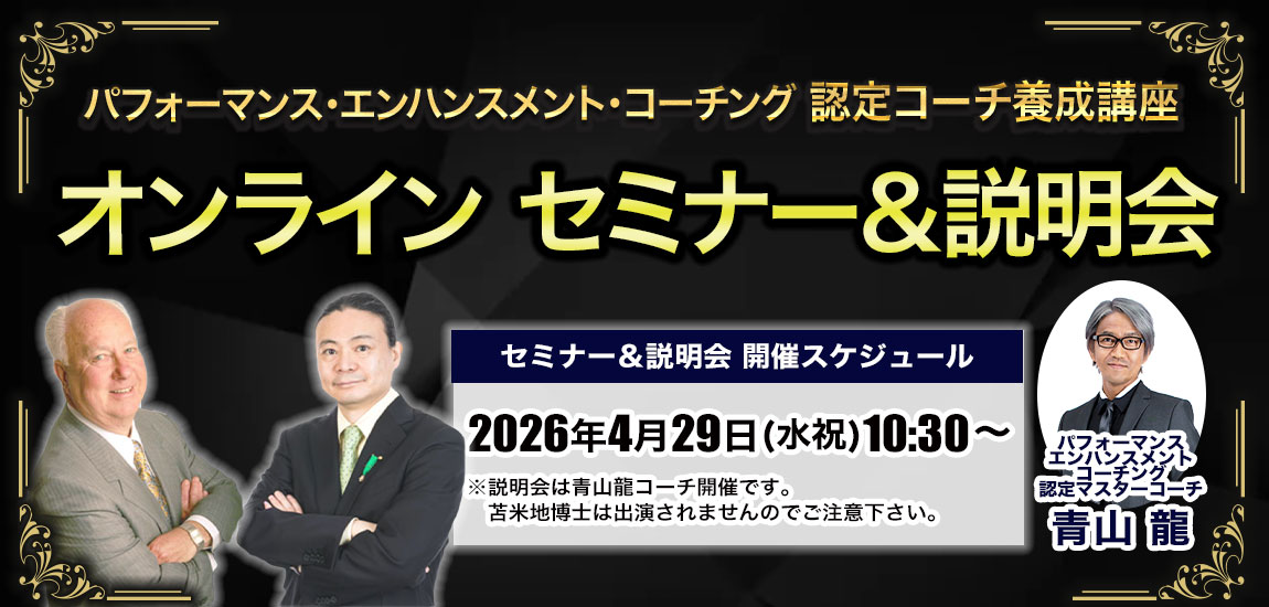 青山龍です。2026年5月下旬から「パフォーマンス・エンハンスメント・コーチング認定コーチ養成講座」をスタートします。講座を開始するにあたり、講座の概要をしっかりお伝えするコーチングセミナー&説明会をオンラインで開催します。前半はコーチングセミナー、後半は説明会となります。コーチングについて詳しく知りたい方、将来認定コーチになりたい方、コーチングを極めたい方など幅広くご参加頂けます。